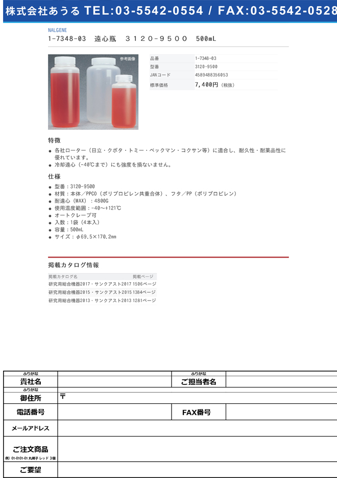 1-7348-03 遠心瓶 500mL 3120-9500 1-7348-03 遠心瓶 500mL 3120-9500 FAXでのご注文はこちら>>