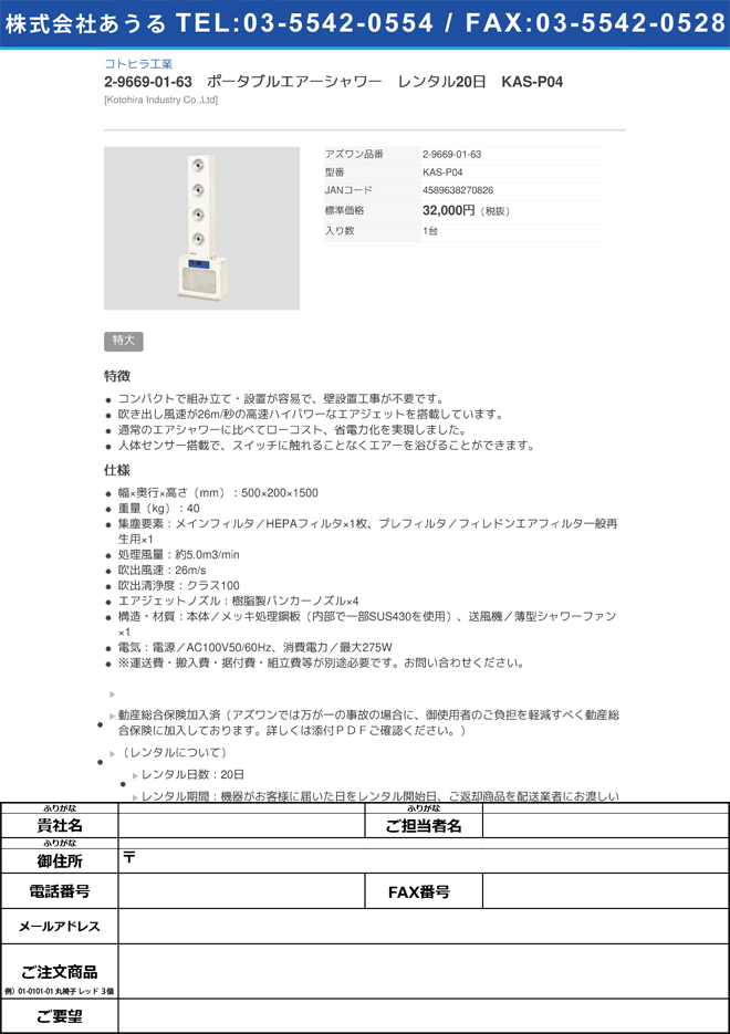 2-9669-01-63 ポータブルエアーシャワー レンタル20日 KAS-P04 2-9669-01-63 ポータブルエアーシャワー レンタル20日 KAS-P04 FAXでのご注文はこちら>>