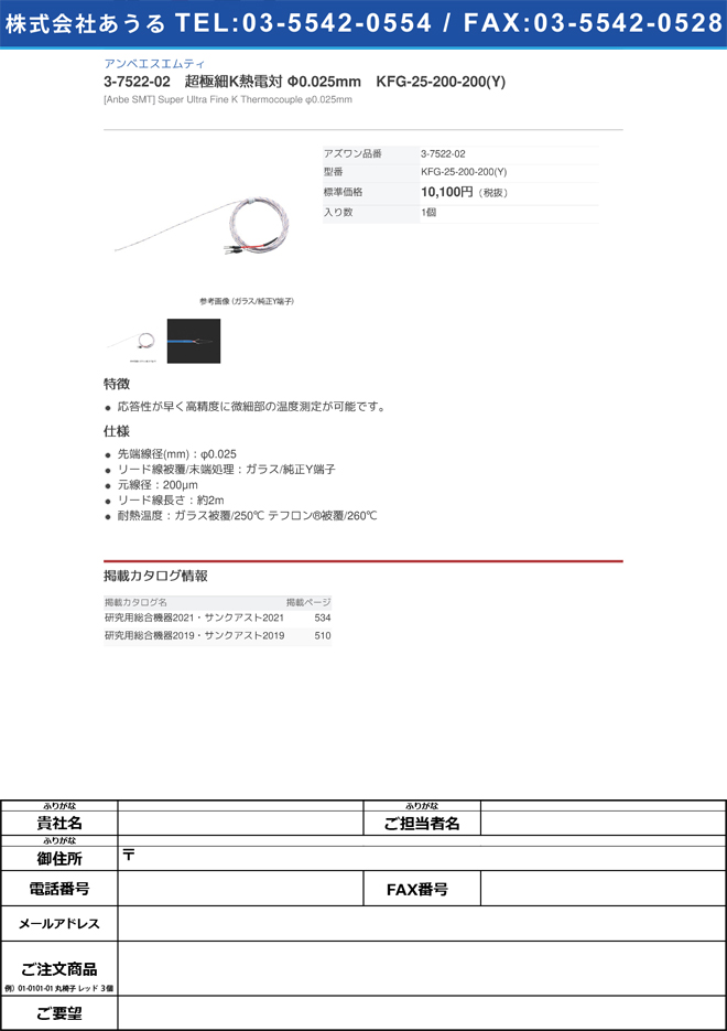 3-7522-02 超極細K熱電対 Φ0.025mm KFG-25-200-200(Y) 3-7522-02 超極細K熱電対 Φ0.025mm KFG-25-200-200(Y) FAXでのご注文はこちら>>