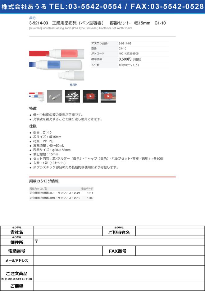 3-9214-03 工業用塗布具(ペン型容器) 容器セット 幅15mm C1-10 FAXでのご注文はこちら>>
